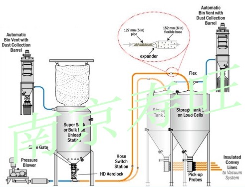 在進料閥的控制下物料從料斗進入發(fā)送器。物料在空壓機產(chǎn)生的高壓氣體的壓力下,料氣混合后,以一定的流速,經(jīng)管道送到終點的料氣分離設(shè)備,分離出物料進入料倉,氣體排入大氣。